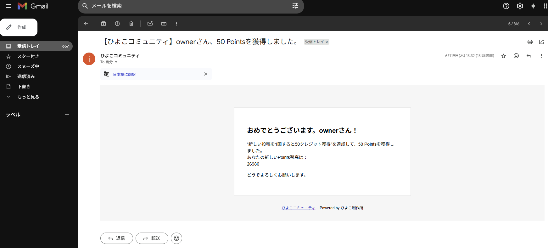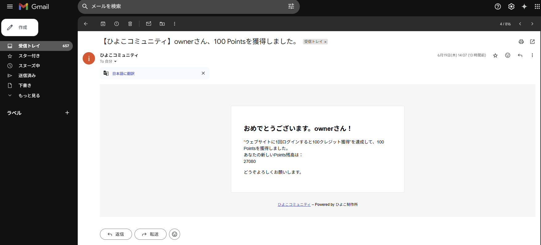 画像のようにメールでアクションに対する通知などやポイント獲得のメールなどが届きます。