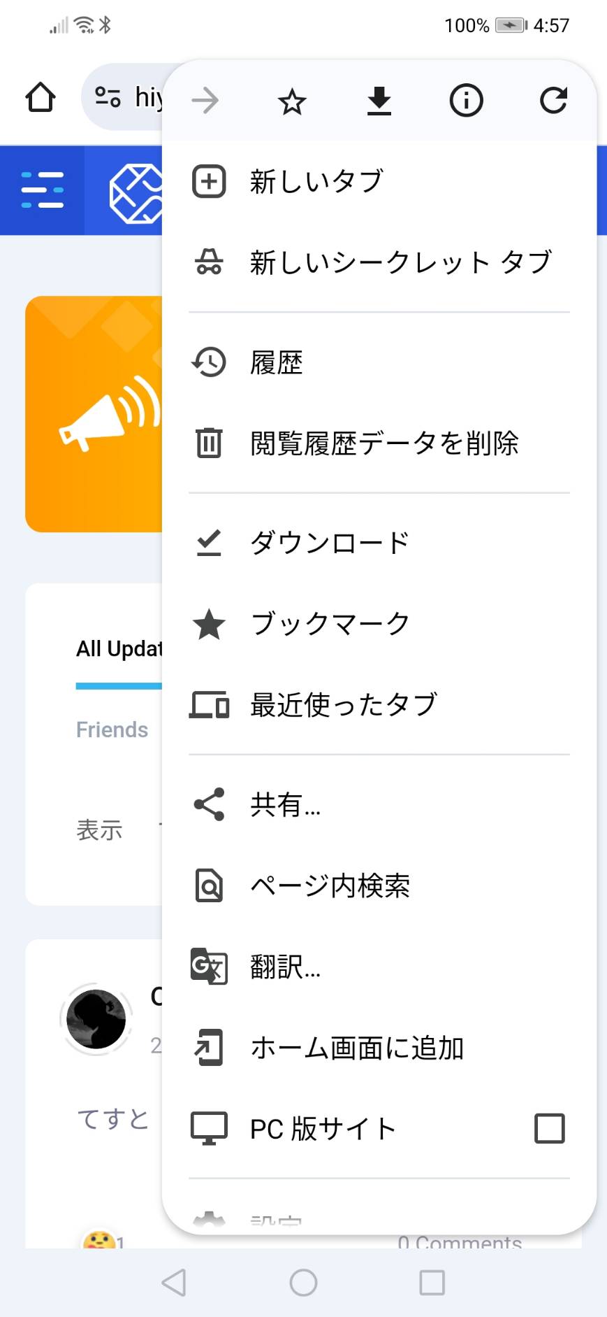 2.ブラウザ右上の3点または3本線を押す。「ホーム画面に追加」を押す。